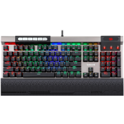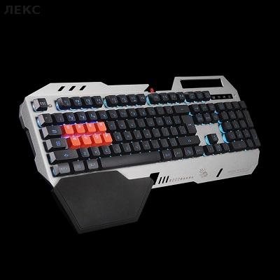 Перед Вами игровая клавиатура A4Tech Bloody B418, выполненная в дерзком корпусе. Конструкция представленного устройства предусматривает наличие 8 механических и 8 силиконовых клавиш. Общее количество клавиш составляет 104. Имеется встроенная многоцветная подсветка клавиш. Также рабочая поверхность клавиатуры оборудована усиленным пробелом. Модель имеет эргономичную и влагозащищенную конструкцию корпуса, который оснащен мягкой подкладкой под телефон, прорезиненными ножками для максимального сцепления клавиатуры с любой поверхностью, а также съемной подставкой для рук.
