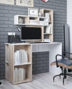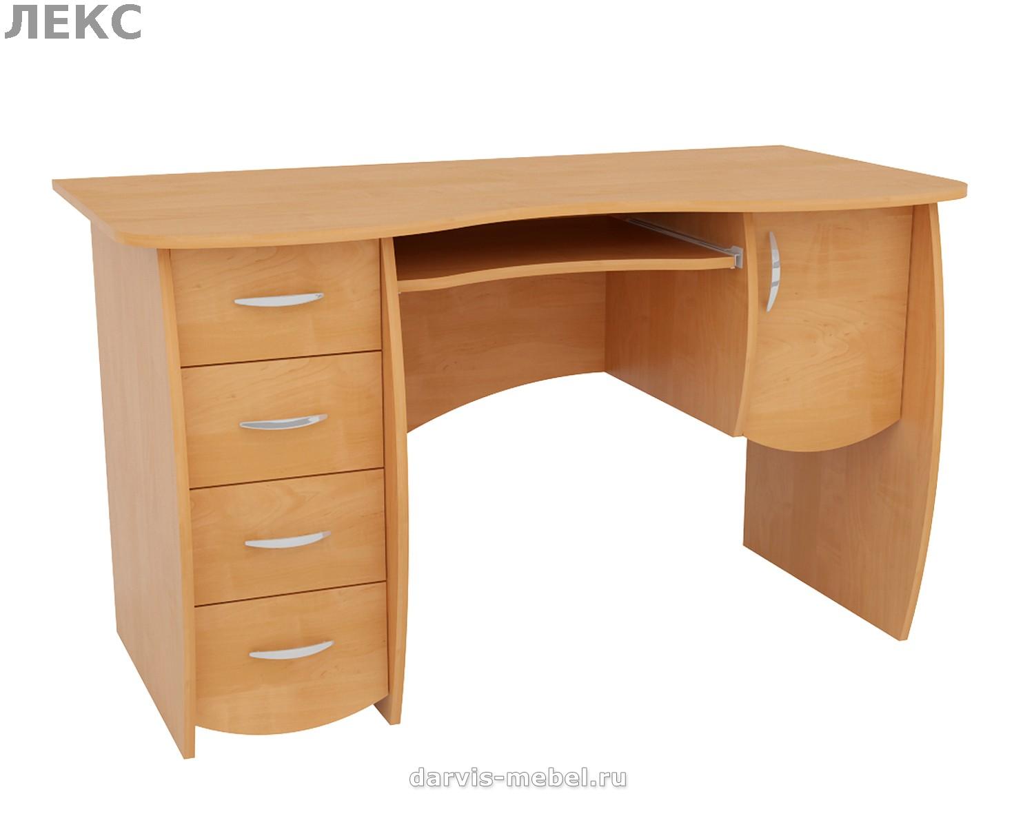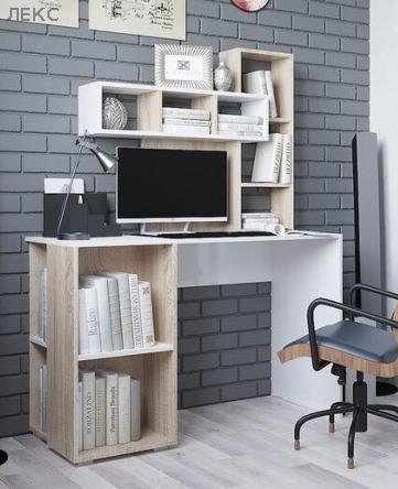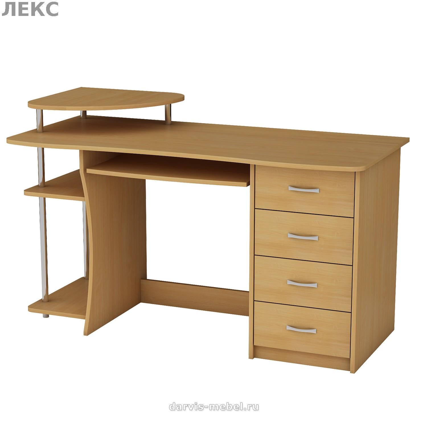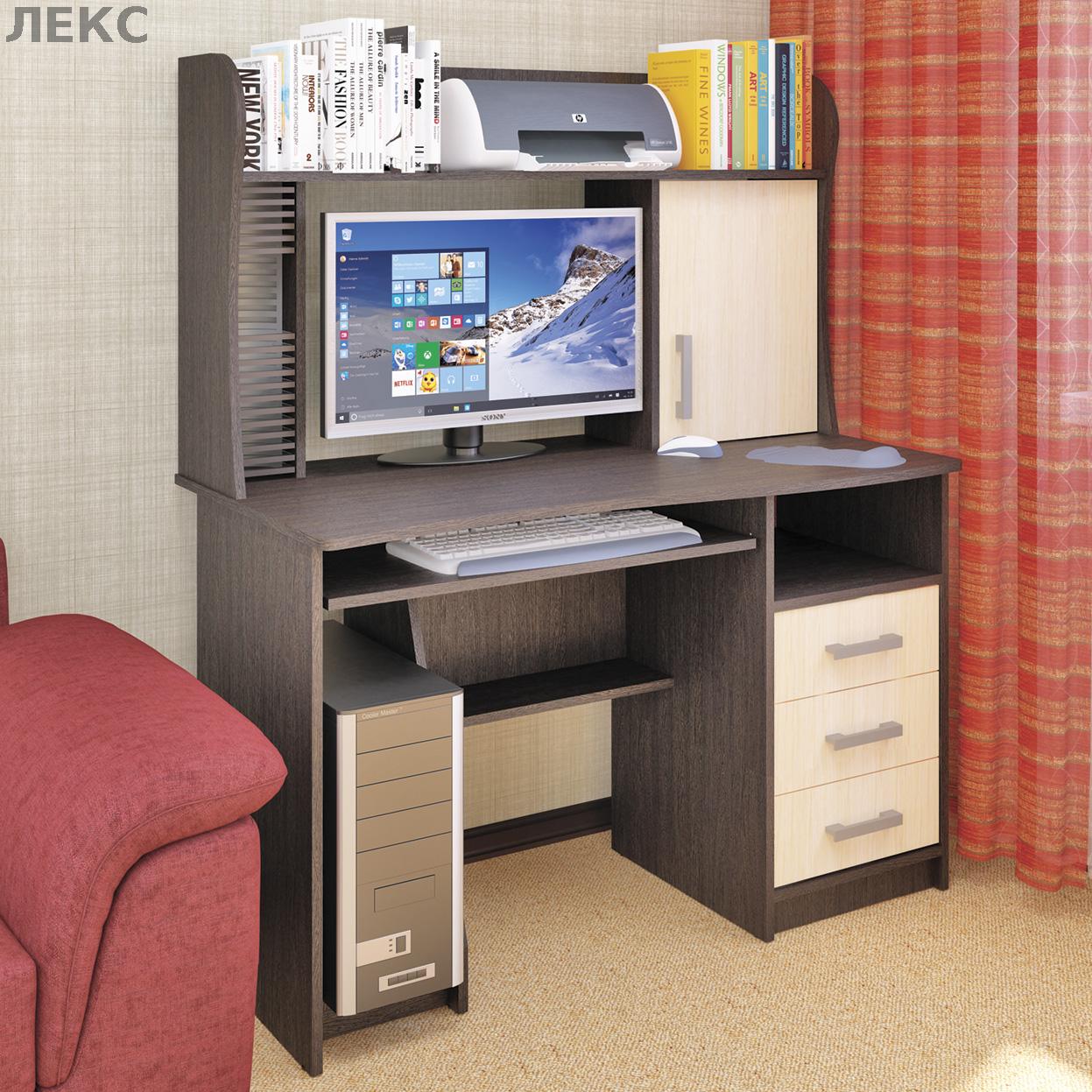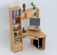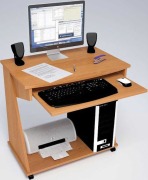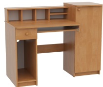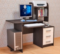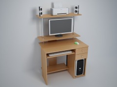 Занимает менее 1 квадратного метра в помещении, при этом удобен и функционален. Стол универсален(часть с ящиками и нишей под системный блок может быть установлена как в левую, так и в правую сторону). Для монитора предусмотрена специальная подставка, а для клавиатуры и мыши - выдвижная полка, благодаря чему столешница остается свободной для работы с бумагами. На надстройке поместятся принтер и колонки, нужные мелочи, а в ящиках - канцелярские принадлежности.