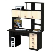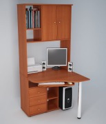 Стол "Пипек" компьютерного – письменного значения, с наличием надстройки с разной величины полками и вспомогательным ящичком, отдельным уёмистым шкафом. В данной модели стола предусмотрено место для системного блока имеется в наличии выдвижная полка для клавиатуры.