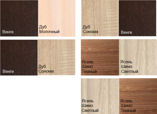 Возможные цвета: Венге, Молочный дуб, Дуб Сонома, Ясень темный / Ясень светлый, Венге/Молочный дуб.