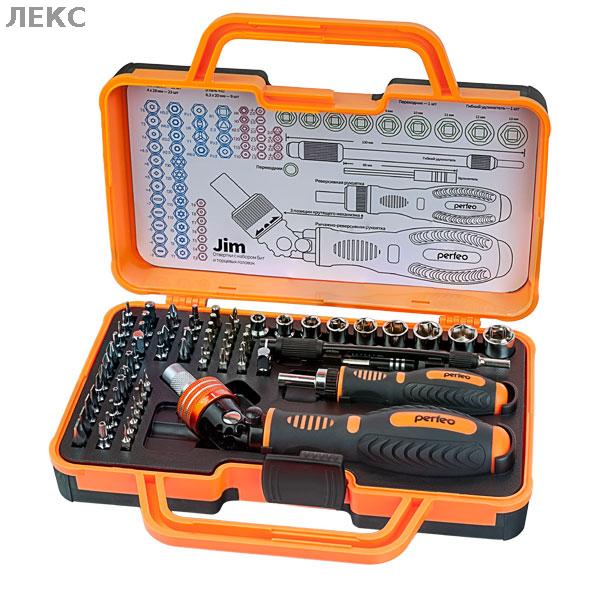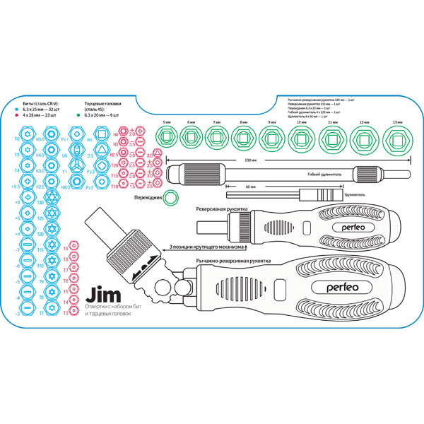 Набор 2в1 Jim предназначен для широкого спектра дел, ремонта мебели, ноутбуков, телефонов и для точных работ. В наборе две отвертки с храповыми механизмами («трещотками»), 55 бит и 9 гаечных головок из стали CR-V, 2 удлинителя и переходник. Большая отвертка снабжена поворотной головкой на +90/-90 градусов, что позволяет развить значительное усилие.